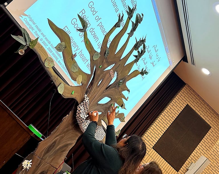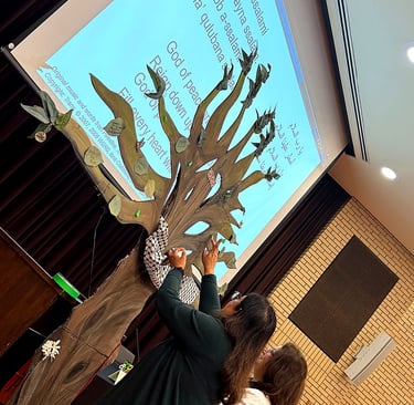 With canvases and materials ready, participants bring the vision to life. In the tree project, each person adds a branch, leaf, or symbol. For the mural, teams paint sections that form a cohesive scene.Reflection & Presentation (20 min):